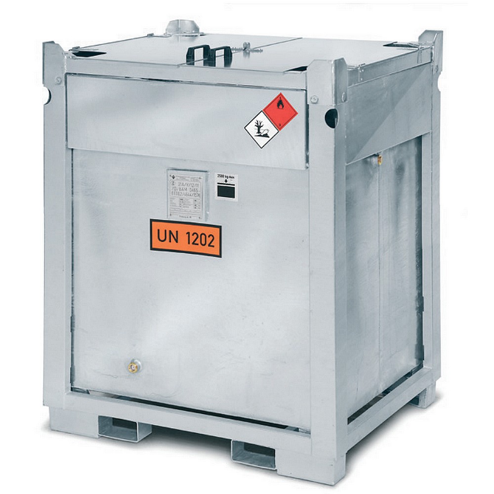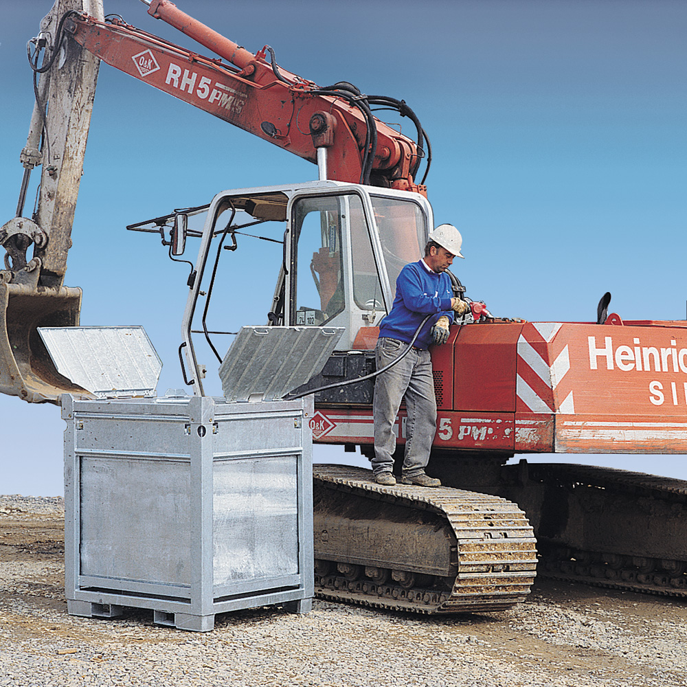 Dieseltankanlage für wechselnde Aufstellorte, z.B. für Baustellen. Die mobile Tankstelle besteht aus einem doppelwandigen Behälter aus feuerverzinktem Stahl und ist mit einem Peilstab und Schauglas für Leckagekontrolle ausgestattet. Zugelassen als Großpackmittel "IBC" für den Transport gefährlicher Güter nach ADR/RID und für die Lagerung wassergefährdender Stoffe der WGK 1 bis 3.